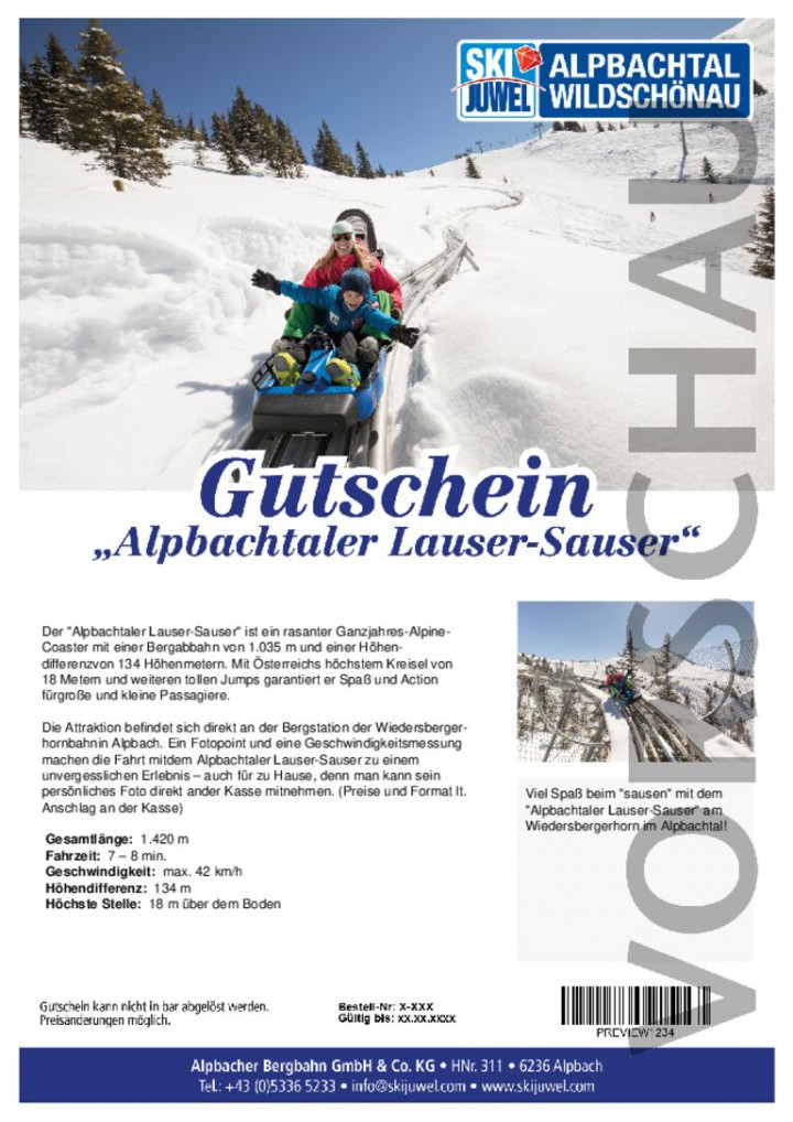 Die Attraktion befindet sich direkt an der Bergstation der Wiedersbergerhornbahnin Alpbach. Ein Fotopoint und eine Geschwindigkeitsmessung machen die Fahrt mitdem Alpbachtaler Lauser-Sauser zu einem unvergesslichen Erlebnis – auch für zu Hause, denn man kann sein persönliches Foto direkt ander Kasse mitnehmen. (Preise und Format lt. Anschlag an der Kasse)